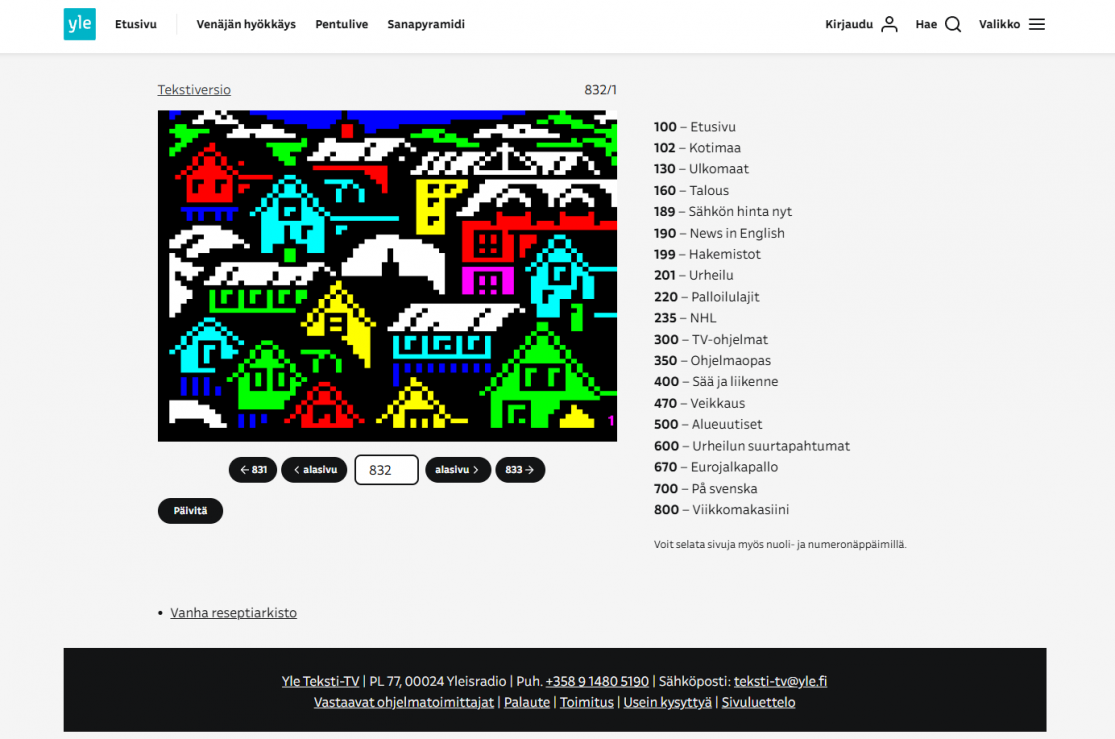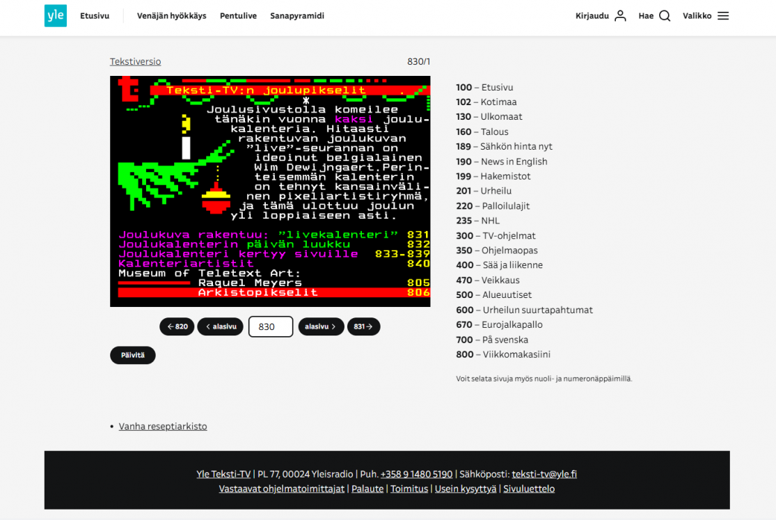 Each day of the month, a new teletext artwork will appear on page 832 of Yle Text, symbolising a single door on a traditional Advent calendar. Previous days’ artworks will also be archived, browsable via Yle’s Advent calendars index page.